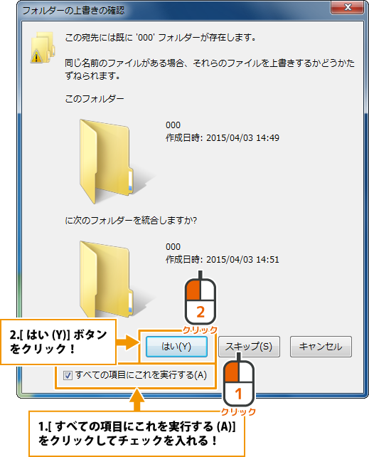 [フォルダーの上書きの確認]画面が表示されましたら、[すべての項目にこれを実行する(A)]をクリックして、チェックを入れ、[はい(Y)]ボタンをクリックします。